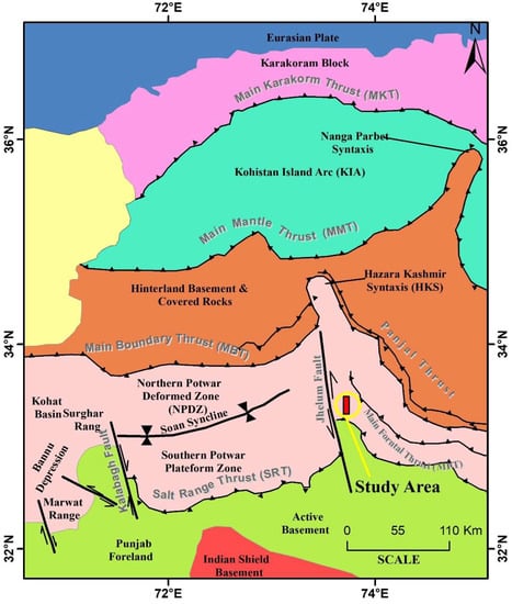 - Khan, M.R.; Hameed, F.; Mughal, M.S.; Basharat, M.; Mustafa, S. Tectonic study of the Sub-Himalayas based on geophysical data in Azad Jammu and Kashmir and northern Pakistan. J. Earth Sci. 2016, 27, 981–988. [Google Scholar] [CrossRef]