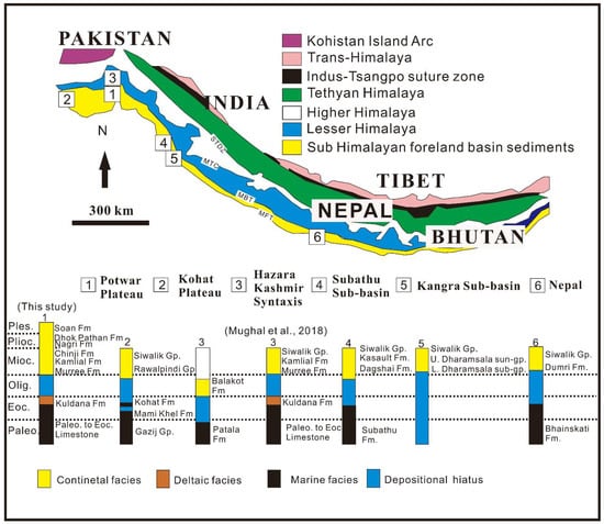 The Himalayas are the world’s youngest, longest, and highest mountain belts, developed during the Cenozoic by the Indian plate ongoing collision with the Asian plate [1,2,3,4]. The Himalayas are categorized into four subdivisions, e.g., Sub-Himalaya, Lesser Himalaya, Higher Himalaya, and Trans-Himalaya [4,5]. The study area lies in the Sub-Himalayan region of the Potwar Plateau of Pakistan (Figure 1 and Figure 2). The Sub-Himalayan regions, also termed as the Himalayan Foreland Basin (HFB), consist of Paleogene–Neogene sediments [6]. The Paleogene deposits of the basin are exposed only along a few sectors of the HFB and have different names in different areas. However, the Neogene alluvial strata are well exposed continuously throughout the length of the HFB, from the Indus Valley (Pakistan) in the west to the Irrawaddy Valley (Myanmar) in the east, and these deposits are known as the Siwalik Group [7].