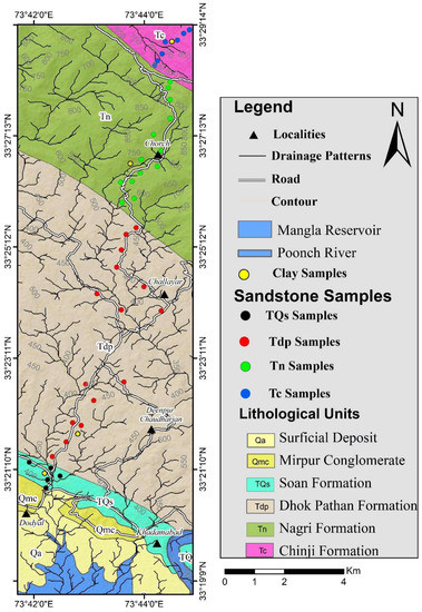 - Chaudhry, M.N.; Ashraf, M. Petrology of middle Siwalik rocks of Kotli area, Azad Kashmir. J. Himal. Earth Sci. 1981, 14, 183–191. [Google Scholar]