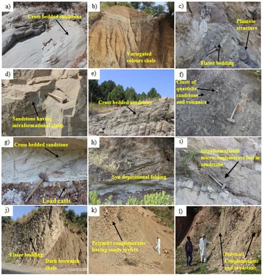 Photograph showing (a) fine-grained ash grey cross-bedded sandstone of Chinji Formation; (b) variegated coloured shale of Chinji Formation; (c) flaser bedding and plumose structure in Nagri Formation; (d) intraformational clasts in sandstone of Nagri Formation; (e) cross bedding in sandstone; (f) clasts of volcanic, quartzite and sandstone; (g) cross bedding and load casts; (h) syn-depositional folding; (i) intraformational microconglomerate bed in sandstone; (j) flaser bedding and dark brownish shale; (k) conglomerate and shale of Soan Formation; (l) polymict conglomerate and sandstone of Soan Formation.