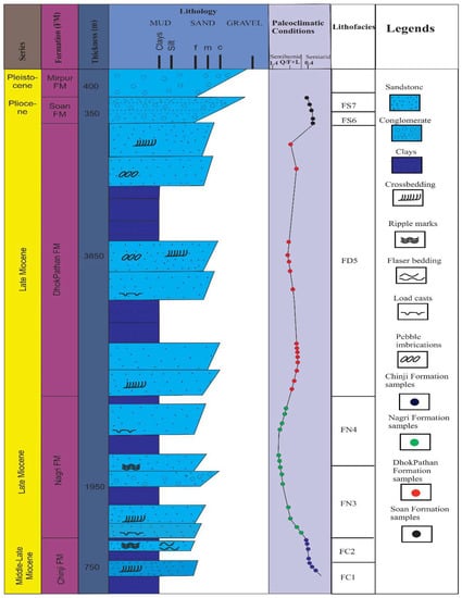 The Siwaliks’ depositional environment is revealed via field and sedimentological investigations. The Chinji Formation is composed mostly of variegated coloured clays (60%–70%; Figure 4b) and ash grey, fine to medium-grained cross-bedded sandstone (30%–40%; Figure 4a), and is divided into two facies assemblages (FC1 and FC2). The Chinji Formation’s FC1 type facie composition (Figure 4a) is distinguished by thick layered ash-grey fine-grained sandstone (St) intercalated with mudstone (Fm) and layers of thin mudstone (Fl). The FC2 type facie assemblage is characterized by fine to medium-grained grey sandstone (St) interbedded with muddy, fine-grained sandstone (Sh) and variegated coloured shales (Fm, Fl). These types of facies indicate that the Chinji Formation was deposited by river meandering flood plain systems [48,59] (Figure 12). These floods occurred as a result of significant rainfall in semiarid conditions during the Chinji Formation’s formation [60]. The Nagri Formation is composed mostly of clays (30%–40%) and grey-coloured cross-bedded, thin to thick-bedded, medium to coarse-grained rippling sandstone (60%–70%) with pebble-sized basalt clasts in its upper part, and it is also divided into two facies assemblages (FN3 and FN4) (Figure 4f). The Nagri Formation’s FN3 facies assemblage consists of medium to coarse-grained, thick-bedded, dark grey sandstone (St) linked with muddy sandstone (Sh) and mudstone (Figure 4c,d), whereas the FN4 facies assemblage (Figure 4e,f) is identified by the presence of medium to coarse-grained, thick-bedded sandstone (St) and dark grey shale. According to these facies assemblages, the Nagri Formation was deposited by a meandering river into a deep, sandy, braided river system [59,61] (Figure 12). The Dhok Pathan Formation has almost equal proportions of sandstone and clay (Figure 4j). The Dhok Pathan Formation sandstone is thick-bedded to massive, cross-bedded to planar-bedded, medium to coarse-grained, and includes pebble to cobble-sized clasts of basalt, rhyolite, quartzite, sandstone, and limestone. In the study area, the Dhok Pathan Formation contains an FD5 facies assemblage. Thick-bedded sandstone (St; Figure 4g), micro conglomerates (Figure 4i), trough stratified gravel (Gt), and pebbly sandstone are also observed. Because of the presence of the FD5 facies assemblage, the Dhok Pathan Formation was most likely deposited by shallow braided sandy river systems (Figure 12) [59,61]. The Soan Formation, on the other hand, shows a coarsening upward sequence and is composed of clays, sandstones, and conglomerates. The Soan Formation had two facies assemblages (FS6 and FS7) in the studied area. The FS6 facies assemblage (Figure 4k) is distinguished on the basis of clast-supported conglomerate (Gp) with reddish-brown sandstone and, to a lesser extent, dark grey shale. The facies assemblage (FS7) is the coarsest facies association, comprising of sandy matrix supported conglomerates (Gms) and well-sorted conglomerates (Gm), with a minor amount of dark grey to brownish-grey shale (Fm) and grey sandstones (Figure 4l). The Soan Formations were deposited by alluvial fan systems, according to this facies assemblage [45,47,48] (Figure 12). Overall, the Siwaliks are coarsening upward, indicating that they were deposited by a fluvial system (Figure 12).