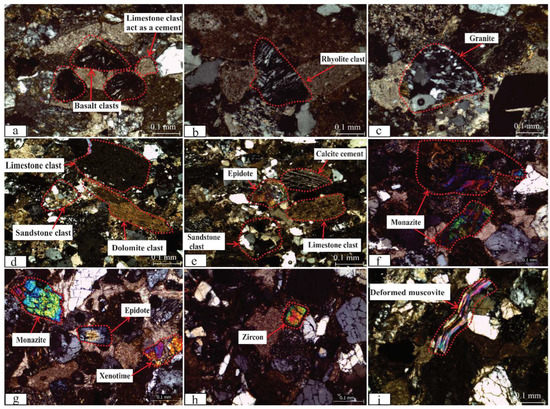 Photomicrographs showing (a) basalt clasts and limestone clasts acting as cementing material, (b) rhyolite clast, (c) granite clast, (d) sandstone, limestone and dolomite clasts, (e) calcite cement, epidote, limestone and sandstone clast, (f) monazite, (g) monazite, xenotime and epidote, (h) zircon, and (i) deformed muscovite.