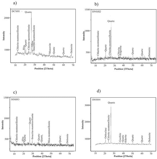 The mineralogy of four clay samples from the Siwalik Group was examined using the XRD technique. These XRD investigations were carried out at the University of Peshawar’s Centralized Resource Laboratory. Before being bombarded with X-rays, the samples were crushed into a fine powder and then fixed to the slide. XRD studies were performed using an X-ray diffractometer and the XPERT PRO modal. This technique comprises the following components: Anode = Cu, Cu K-Alpha1 = 1.540598 Å, Cu K-Alpha2 = 1.544426 Å, Current = 30 mA, Voltage = 40 Kv, Divergent silt = Fixed − 1.52 mm, Receiving silt = 0.1 mm, Scan range = 10–80, Scan axis = Gonio, Scan type = Continuous, Scan step size = 0.01, Time per step = 0.25. The mineral identification in the clays sample was done using the Jade 6 programme. The shale minerals were obtained using the XRD procedures of Goldsmith and Graf [43] and Goldsmith and Heard [44].