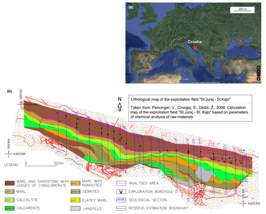 (a) Geographical location [24] and (b) lithological map of the exploitation field “St. Juraj–St. Kajo” (after [23,25]).