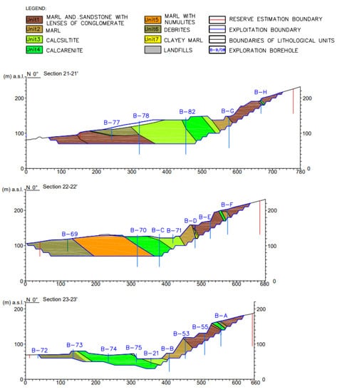 According to chemical analysis from 35 exploration boreholes drilled in unit 1, a total of 11 interlayers were defined within. An example of interlayers of clayey marl, marl, and calcisiltite was shown in geological sections 22–22′ (Figure 3) [31].