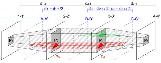 Volume calculation using geological sections was briefly described in Figure 4. There are four main vertical sections (1–1′; 2–2′; 3–3′; 4–4′) at equal distances (d1,2; d2,3; d3,4) and three auxiliary vertical sections (A–A’; B–B’; C–C’) at half of the distance between main sections (dA; dB; dC). Grey, red, and green colours indicate the borders of the geometric bodies, i.e., the theoretical case with three different types of reserve where volumes were calculated. The grey body intersects the main sections with its surfaces (P1; P2; P3; P4). The total volume of the grey body (Equation (6)) is the sum of three volumes: one on the distance d2,3 according to Equation (4) and two on the distances d1,2 and d3,4 according to Equation (5). Red and green bodies are inside the grey body and represent the interlayers. The difference between the red body and the green body is that the red body is elongated over two main sections (P5; P6) while the green body intersects one main section (P7). Both cases (red and green) show a significantly lower number of data than the grey case, and consequently, uncertainty is larger. In such cases, where the right extensions of strata cannot be determined, the assumption that their margins are at half the distance to the next section is applied. It means that on the auxiliary section, its area (PA; PB; PC) is equal to zero. As the grey body is the largest, there are no additional, on its margins cannot be applied the rule of wedging like for green and red volumes.