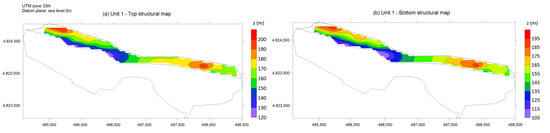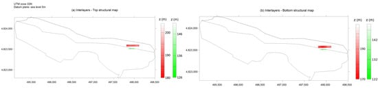 Figure 7. Top and bottom interpolation maps of the interlayers. (a): top, (b): bottom. - Calculating the volume of unit 1 using top and bottom structural maps of unit 1 and its interlayers.