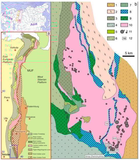 (a) Position of the Kempirsay ophiolite massif within Uralian fold belt (after [32]) and its schematic geological map (after [15,24]) (b): 1–6—Stratified rocks: 1—Yuzhnomugodzhary zone (basalts (S-D1, D2), flyschoids and olistostromes (D3-C1); 2—Ebeta zone (basalt-andesite-rhyodacite units, carbonaceous-silicite and greywacke formations (V?PZ1–2); 3–6—Sakmara zone: 3—basalt-andesite-dacite units, greywacke phthanite and carbonate formations (PZ1–2), 4—pillow lavas and pyroclastics of basalt-andesite-rhyodacite units with members of phtanites and clay-siliceous shales (PZ1–2), 5—phtanites and carbonaceous shales (O2), 6—tholeiite pillow basalts with phtanite lenses (O2), 7–10—Kempirsay massif: 7—swarms of parallel diabase dykes and isotropic hornblende gabbro, 8—Kyzylkain unit of pyroxenite-gabbro rocks, 9—Kokpekta unit of olivine gabbro and troctolite, 10—upper mantle harzburgite, lherzolite and dunite, 11—chromitites (a—unique and large deposits; b—ordinary deposits and occurrences; icon size correlates with ore reserves), 12—numbers of holes from which samples were studied: 766 (samples 7087, 8156), 820 (sample 820/300), 809 (sample 809/347), 012 (sample 012/300.9), 046 (sample 046/359.5), 016 (samples 016/925 and 016/1108.5), 079 (sample 079/90.7), 005 (sample 005/263.6), 094 (sample 094/238.7), 947 (sample 947/540).