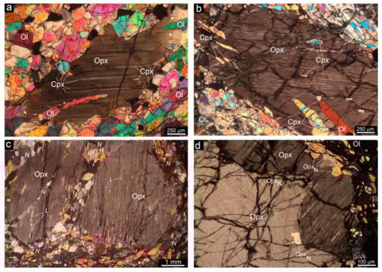 Structural and morphological features of pyroxene grains in lherzolites from Kempirsay massif: (a,b)—Deformation of Opx porphyroclast according with impregnation along shear zones olivine and diopside, and a deformation-indused formation of lamellae and neoblasts of diopside and pargasite (a—sample 7087, b—sample 016/1108.5); (c)—Deformed Opx porphyroclast with abundant lamellae (L) of diopside, pargasite, spinel, and a neoblast cluster (N) along shear zones (arrows) (sample 820/300); (d)—Initial stage of neoblast formation along blocks boundary and close to grain edges in deformed Opx grain (sample 809/347). Cpx—clinopyroxene.