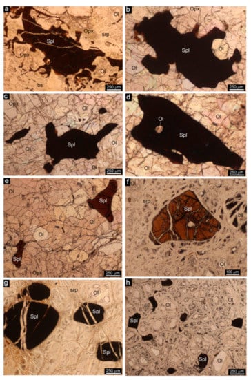 The morphology of Cr-spinel grains varies from amoeboid, vermicular and holly-leaf in lherzolites to subhedral in harzburgites (Figure 4a–d). A similar pattern is observed in many ophiolite massifs and upper mantle xenoliths (e.g., [17,36,37,38]). Many accessory spinel grains contain inclusions of olivine, orthopyroxene, clinopyroxene, and pargasite. In addition, there are numerous fragments of silicate mineral grains incompletely captured by branches of xenomorphic spinel grains (Figure 4a–d). We had formerly noted similar features in lherzolite massifs of the Southern Urals [11,23]. In dunites and dunitic serpentinites mainly found close to ore deposits, Cr-spinel grains show a nearly euhedral habit (Figure 4g,h). However, their characteristic features are smooth boundaries and the presence of cracks along grains commonly perpendicular to foliation and banding of rocks.