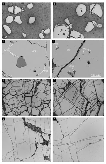 An even greater consolidation is recorded in massive chromitites. It is expressed in the presence of anhedral segregations of vein minerals formed by “squeezing out” of weaker silicate minerals from gaps between rigid chromite grains (Figure 5g). The consolidation is also reflected in sharp thinning and gradual vanishing of boundaries between Cr-spinel grains that become angular-shaped (Figure 5g,h).