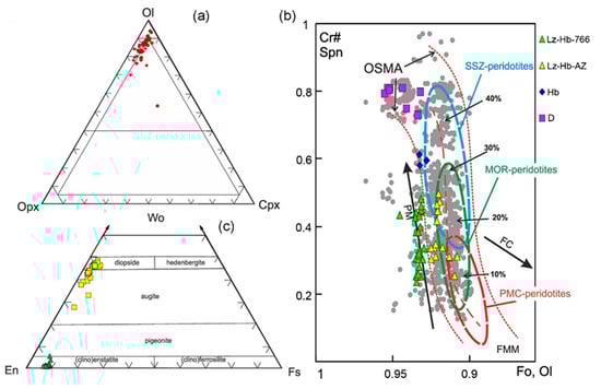 (a)—Normative mineral compositions of peridotites inferred from chemical composition; (b)—OSMA diagram for coexisting Ol and Cr-spl grains; here, percent notes partial melting degree in experiment after [40], that corresponds to Ol-Spl compositions in restite; gray points are Ol-Spl compositions in lherzolite-type massifs of South Urals after [41]; Lz-Hb-766—peridotite of well 766; Lz-Hb-AZ—peridotite from Almaz-Zhemchuzhina deposit area; Hb—harzburgite, D—dunite; (c)—Compositions of Opx and Cpx on the triangular diagram En–Wo–Fs.