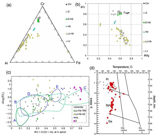 (a)—Al–Cr–Fe diagram for three-valent cations of Cr-spinel; (b)—#Cr = Cr/(Cr + Al) vs. #Mg = Mg/(Mg + Fe) diagram for Cr-spinel grains; (c)—#Cr vs. Δlog(fO2) diagram; fields: 1–3, peridotite xenoliths: 1, primitive; 2, slightly metasomatized; 3, strongly metasomatized; 4, 5, abyssal peridotites with spinel (4) and plagioclase (5), after [42]; KrNrMn—lherzolite-type massifs of South Urals (Kraka, Nurali, Mindyak); Lc-Hb-766—peridotites of well 766; Lz-Hb-AZ—peridotite from Almaz-Zhemchuzhina deposit area; Hb—harzburgite, D—dunite; (d)—Diagram of PT formation conditions of mineral assemblages using pyroxene geothermometers and geobarometers [43,44]; gray points are samples of lherzolite-type massifs of South Urals.