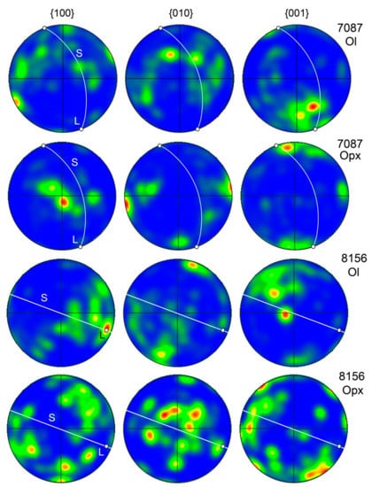 In sample 8156, the maximum of the [100] olivine axis is close to lineation, the [010] axis form the maximum almost perpendicular to the foliation, and the [001] axis is either bunched near it or inclined at an acute angle to foliation. A similar pattern is characteristic of fabric type A [35,53], which is usually formed during slip by [100] (010) system. The axes of orthopyroxene from sample 8156 produce numerous dispersed maxima on the pole figure, which makes unambiguous interpretation difficult. The observed fabric pattern is closest to the ABC type, which was established in some experiments on the deformation of orthopyroxene [54].