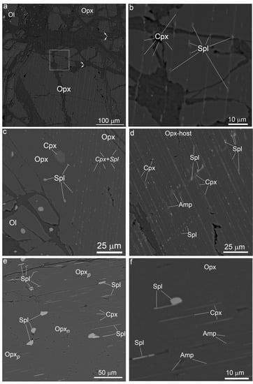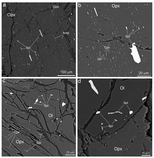 Fine segregations of other phases, i.e., diopside, pargasite and Cr-spinel, with their size ranging from fractions of a micrometer to a few tens of micrometers are observed in almost all of the studied ultramafic rock samples with well-preserved relics of primary silicates, in plastically deformed orthopyroxene grains (Figure 9 and Figure 10). They usually occur in parallel swarms in large porphyroclasts (Figure 9a,b). In the rim of large Opx grains, fine segregations of pargasite, spinel and diopside are associated with fine equiaxial olivine and enstatite grains depleted in minor elements. Inside the deformed olivine grains, there are usually rod-like or vermicular segregations of Cr-spinel and tiny segregations of pargasite (Figure 9c,d).