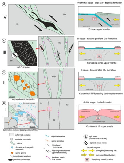 - Saveliev, D.E.; Puchkov, V.N.; Sergeev, S.N.; Musabirov, I.I. Deformation-induced decomposition of enstatite in mantle peridotite and its role in partial melting and chromite ore formation. Dokl. Earth Sci. 2017, 476, 1058–1061. [Google Scholar] [CrossRef]