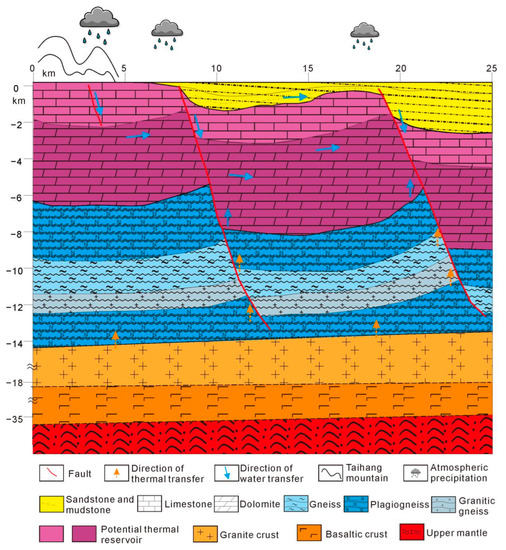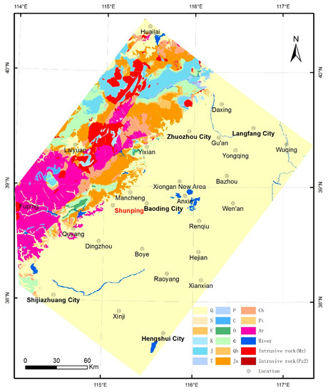 The water supply of the XNA and Shunping area is mainly meteoric precipitation from the Taihang Mountain area [50,51]. The main bedrock thermal reservoirs are carbonate rocks of the Wumishan Formation of the Middle Proterozoic Jixian System. They have certain similarities in geothermal–geological conditions.