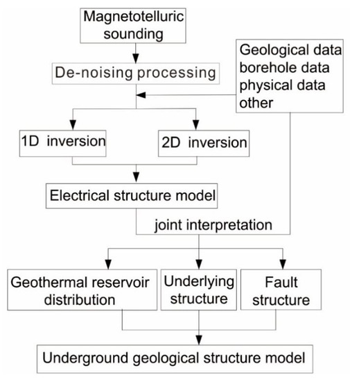 The Aether magnetotelluric system, produced by the CG Company of the United States, is used in this study. It has two electric and three magnetic (five channel) data acquisition functions. The acquisition unit is light, small, and easy to operate, with great flexibility. Additionally, it is more suitable for working environments such as terrain fluctuation and lakefront because there is no need for a cable connection between receivers. The magnetotelluric inversion and interpretation processes are shown in Figure 3.