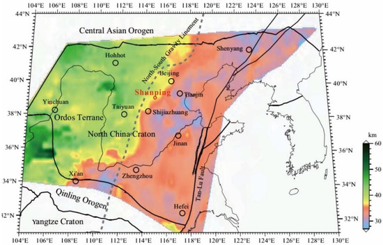 Map of Moho depth distribution of the NCC (modified from [35]).