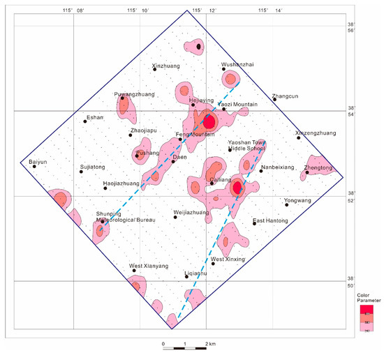 The fractures and unconformities of different sizes in the study area are hot water migration channels (fluid channels). The precipitation from the Taihang Mountains in the west is transported to the thermal reservoirs through faults and unconformity surfaces, especially the faults (F2, F3, and their secondary faults) in the bedrock outcrop area of the Taihang Mountains, which are well connected with the surface water and the thermal reservoirs, together with the heat source. It can be noted from the anomaly diagram showing Hg in the soil (Figure 8) that the distribution of the Hg anomaly is obviously in the NE direction, indicating the two faults that pass through Yaozishan village and Cailiang village. Their positions are relatively consistent with the F2 fault location predicted by MT, and they are the main fault and branch fault of F2. The Hg anomaly in the middle area of the two faults indicates multiple secondary faults in the area, which can communicate atmospheric precipitation and thermal reservoir well. The intensity of the Rn anomaly is weaker than that of the Hg anomaly (Figure 9), but the predicted faults of the Rn anomaly zone in the north are consistent with the northern fault structure F2 inferred by Hg, and Rn anomalies also mainly distributed in the NE direction. Rn anomalies show that the NE-trending faults in the southeast are close to F1, confirming the existence of F1 and its secondary faults.
