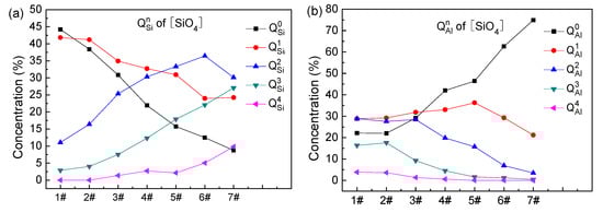 Figure 6 shows the distribution of in [SiO4] and [AlO4] tetrahedra, where m (m = Si, Al) represents the atoms connected to BO in the [SiO4]4−/[AlO4]5− tetrahedra and n represents the number of Bos in each [SiO4]4−/[AlO4]5− tetrahedron. Figure 6a shows that, as the ratio increases, the concentrations of in the [SiO4]4− tetrahedra gradually decrease, the concentration of first increases and then decreases, and the concentrations of and gradually increase. In addition, is produced only in a small amount when the ratio of is 1.4.