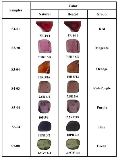 Representative spinel samples of each color group presenting appearances before and after heating as reported in the main text.