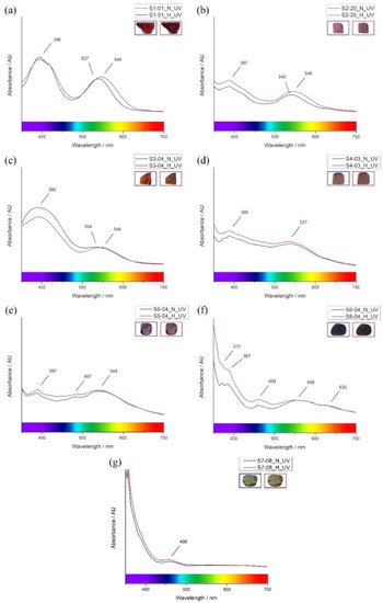 Absorption UV-VIS-NIR spectra of natural and heated spinels are representatively shown in Figure 2. Natural red, magenta, and orange spinels (Figure 2a–c, respectively) reveal similarly two distinct absorption bands. Natural red spinels show absorption peaked at 396 nm and 537 nm which the later peak is significantly shifted to 546 nm after heating. Natural magenta spinels show absorption bands peaked at 387 nm and 540 nm; after heating, they turn to have higher intensity with significant shift of 540 nm absorption to 546 nm. Natural orange spinels show absorption peaks at 390 nm and 534 nm which obviously present the significant intensity decrease at 390 nm with very slightly shift and 534 nm absorption peaked to 546 nm without significant change in intensity. Natural red-purple spinel (Figure 2d) presents mostly comparable characteristics of two main absorp-tions of natural magenta spinels at 390 nm and 537 nm which clearly show intensity in-crease after heating. Natural purple spinel (Figure 2e) mainly yields absorptions at 390 and 543 nm with minor absorption at 487 nm whereas heated purple spinel turns slightly to greater absorption intensity covering the range of 390–543 nm. Blue spinels (Figure 2f) exhibit strong absorptions at 372 and 387 nm with a minor absorption around 459 nm as well as absorption bands centered around 558 and 630 nm; after heating, significantly higher absorption intensities of 372 and 387 nm, as well as 459 nm, are observed. Green spinel yields only little absorption around 456 nm which is likely unchanged after the heating experiment (Figure 2g).