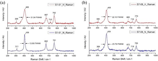 After heating, all spinel varieties still show the same peak positions, however, their intensities seem slightly decreased and broadened, especially the main 406 cm−1 peak. This peak expanded its width in most cases (Figure 3a) except for green spinel (Figure 3b). Consequently, the full width at half maximum (FWHM) of the 406 cm−1 peaks is widened with averages of 11.10 cm−1 in purple spinels up to 17.01 cm−1 in red spinels after heating. Magenta, orange, red-purple, and blue spinels also reveal extension of FWHM with averages of 13.72 cm−1, 14.62 cm−1, 11.49 cm−1, and 12.51 cm−1, respectively, after the heating experiment. On the other hand, the green spinel (Figure 3b) shows FWHM of the 406 cm−1 peak shrunken around 1.69 cm−1 after heating. In addition, a tiny peak appears between 712–726 cm−1, such as 715 cm−1 in red spinel (Figure 3a), which may be evidence of heating in most spinel varieties except for green spinel which such peak (719 cm−1 in Figure 3b) appears before and after (716 cm−1) heating.