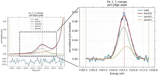 XANES spectra are obtained from all 22 spinels of 7 varieties, as well as standard materials such as Fe-foil, Cr-foil, V-foil, Fe(II), Fe(III), Cr(III), Cr(VI), V(III), and V(IV) model compounds. The properties of pre-edge absorption are important to assess the oxidation state and coordination number. Using the XAS Viewer application [41], the centroid position and integrated intensity of pre-edge XANES spectra are determined to stimulate different valency model compounds and their pre-edge peak compositions. Figure 5 depicts the result of Fe pre-edge composition by the XAS Viewer program. In addition, the fluctuation in oxidation state and its symmetry for Fe and V are displayed as shown in Figure 6a,b, respectively.