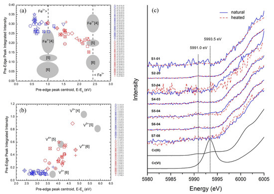 Diagrams present integrated pre-edge intensity and pre-edge peak centroid (E-E0) parameter of all spinel samples in various (a) Fe- and (b) V-oxidation state and their coordination, whereas (c) represented normalized Cr pre-edge XANES spectra of natural (blue lines) and heated (red lines) spinels compared with Cr(III) and Cr(VI) standards. Number [4], [5] and [6] represent a 4-fold, 5-fold, and 6-fold coordinated atoms, respectively.