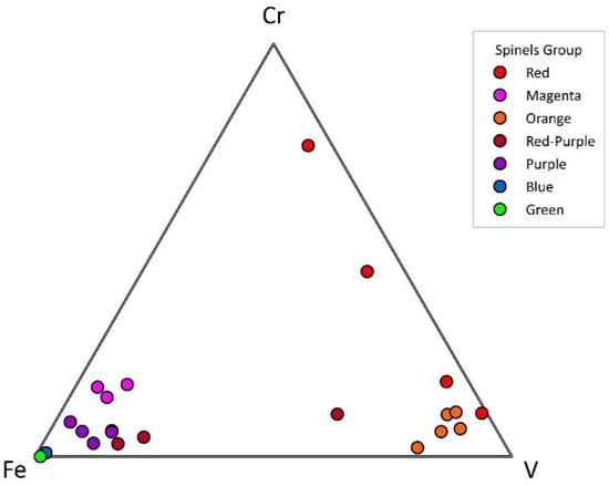 As reported in the mineral chemistry, Fe, Cr, and V appear to be the major chromophores of spinel varieties. Their elemental ratios are displayed in a ternary diagram (Figure 7), which graphically demonstrates that red and orange spinels are more closely associated with Cr and V contents, respectively, while the others (magenta, red-purple, purple, blue, and green) are more generally associated with a greater Fe component. As a result, Fe is more dominant and is more likely to be associated with the purple, blue, and green colors. V is likely responsible for orange-colored spinels due to its highest ratio compared to Fe and Cr. However, V and Cr are almost certainly involved in the red color, with equally high contents of both elements tending to cause red. On the other hand, lower Cr may appear orange-red. Our finding agrees well with the observation of Andreozzi et al. [7] which suggested that high V content induces orange but high Cr content influences red in spinels. Therefore, two groups of spinels, including Cr-V-related color spinels (red) and orange) and Fe-related color spinels (magenta), red-purple, purple, blue, and green) will be discussed further.