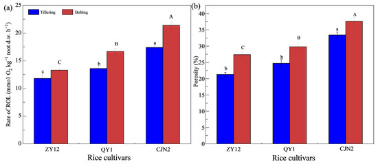 Radial-oxygen-loss rates (ROL) (a), and root porosity (b) of rice. Data are the mean ± SE (n = 3). Different upper- and lowercase letters above bars indicate significant differences among the cultivars at the tillering and bolting stages, respectively.