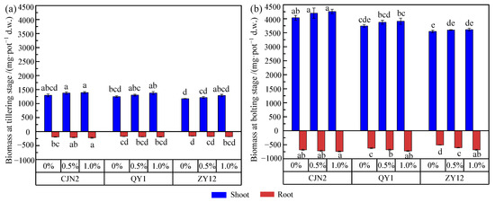 The shoot and root biomass differed significantly among the three rice cultivars, which were ranked as CJN2 > QY1 > ZY12 (Figure 2.). In the 0% RM treatment, compared with that of ZY12, the shoot biomasses of QY1 and CJN2 at the tillering and bolting stages were increased by 10.22% and 13.73%, and 8.52% and 5.50%, respectively. CJN2 and QY1 had a higher root porosity and ROL rate, which can increase the water-holding capacity of the soil and nutrients, to promote biomass accumulation of rice [18,27]. The addition of RM positively affected rice growth at the tillering and bolting stages and biomass was obviously increased in response to RM addition. The shoot biomasses of ZY12, QY1, and CJN2 with 1% RM treatment were 3611, 3911, and 4259 mg·pot−1 at the bolting stage, respectively, which represented increases of 1.8%, 4.5%, and 5.58%, respectively, compared with those with the 0% RM treatment. This finding was consistent with previous results for rice and other plant species [3]. Yang et al. [3] found that the cucumber shoot biomass in response to RM addition was approximately two-times greater than that of plants without RM application. The addition of RM might relieve rice growth in Cd-contaminated soil from two aspects. First, RM provides additional nutrients for plant growth, such as calcium (Ca), magnesium (Mg), and silicon (Si) [28,29], which may improve the soil fertility and increase plant biomass. Second, the application of RM as an amendment can immobilize the available Cd in the soil and reduce Cd accumulation by rice, thereby reducing Cd toxicity and enhancing the growth of rice [30].