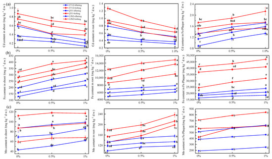 Effect of red mud (RM) on metals’ concentrations in the shoots, roots, and Fe plaque. (a) cadmium (Cd) concentration in rice tissues; (b) iron (Fe) concentration in rice tissues; (c) manganese (Mn) concentration in rice tissues. Different lowercase letters indicate a significant difference among treatments (p < 0.05).