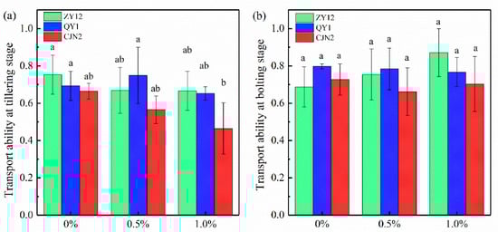 Effect of red mud (RM) on cadmium (Cd) transportability in three rice cultivars. (a) the Cd transportability in rice at tillering stage, (b) the Cd transportability in rice at bolting stage.