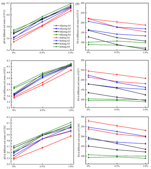 Wetland plants, including rice, can actively change the rhizosphere O2 concentration, Eh, and pH, which are crucial physicochemical properties for biogeochemical processes [34,35] (Figure 5). In the present study, the Eh values in S1 (154–279 mv) were distinctly higher than those in S4 (72–107 mv) (Figure 5a). In contrast, the pH in S1 was obviously lower than that in S4; for each cultivar at the tillering and bolting stages under the RM treatments, the differences ranged from 0.02 to 0.22 pH units (Figure 5b). These results reflected that the water management strategies in paddy fields are either continuous flooding or intermittent flooding. The flooding of paddy fields leads to anaerobic conditions [36], which may decrease the pH and increase Eh in the rhizosphere soil, leading to higher Eh and lower pH in S1. The pH in the soil zones of soil amended with RM at both developmental stages was distinctly higher than that of the 0% RM treatment, and increased with the elevation in RM concentration. The pH value was significantly increased by 0.39–0.53 units at two stages under RM treatments. Such an increase in soil pH is consistent with many previous reports in which RM was used as an amendment [15,37]. This response reflects the alkaline nature of RM, for which the pH is usually >10 [13]. In contrast to the pH, the Eh value decreased with RM addition. Positively charged ions (such as Ca2+ and Mg2+) are the main reason for the reduction in Eh [38].