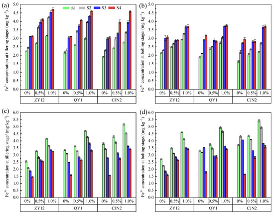 The Fe3+ and Fe2+ concentrations differed significantly between soil zones S1 and S4, and the Fe3+ concentration in S1 was higher, whereas the Fe2+ concentration in S1 was lower than those in S4 for three rice cultivars at both stages under the RM treatments (Figure 6). The rhizosphere Fe3+ and Fe2+ concentrations significantly increased for each cultivar at the tillering and bolting stages under the RM treatments. The rice roots appeared reddish under treatment with 0.5% and 1% RM. These results indicated that RM addition leads to an increment in Fe2+ concentration, which facilitates Fe plaque formation on the root by oxidization of Fe2+ to Fe3+ [39]. The degree of Fe plaque formation on the roots of the rice cultivars was ranked as follows: CJN2 > QY1 > ZY12 under RM amendment. In addition, the increase in RM concentration was indicated to enhance Fe plaque formation of the cultivar with high ROL and root porosity.
