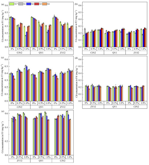 The concentrations of the five fractions of Cd in paddy soil in the present study are given in Figure 7. In general, plants tend to absorb F1 in soil, whereas Cd of the F3, F4, and F5 fractions are not easily absorbed.