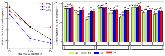Effect of red mud (RM) on the cadmium (Cd) mobility factor of rhizoboxes. (a) the mobility factor of Cd in soil at tillering stage; (b) the mobility factor of Cd in soil at bolting stage. Different lowercase letters indicate a significant difference between rice cultivars under the different RM treatments (p < 0.05). Different uppercase letters indicate a significant difference between soil zones (p < 0.05).