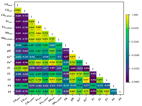 A significant negative correlation was observed between Feroot, Mnroot, CdFe plaque, FeFe plaque, MnFe plaque, pH, Fe3+, F2, F3, F5, and F1, whereas a significant positive correlation with Cdroot and F1 in the S1 zone was observed (Figure 9). These results for the selected samples indicated that the Cd concentration in the roots and F1 should be reduced to decrease the accumulation of Cd in the shoots. Significant negative correlations were observed between F1 and pH, Fe2+, and Fe3+, which accounted for the significant decrease in Cd content in F1 after RM addition. The pH of the soil was increased because RM is alkaline and contains large amounts of Fe and Al, which can prevent the conversion of other forms of Cd to exchangeable Cd and reduce Cd accumulation by rice. The concentration of Cdroot was significantly negatively correlated with Fe and Mn content in the roots and Fe plaque on the root surface. The Cd2+ may be separated out owing to the increase in Fe and Mn contents of Fe plaque on the root surface, preventing the transport of Cd in rice roots and reducing the accumulation of Cd by rice. The present and previous studies have demonstrated that RM is an effective amendment to reduce the exchangeable Cd content in paddy soil and Cd accumulation by rice [13,17]. These results indicate the potential of in situ remediation by RM addition, which can improve the soil’s physicochemical properties by increasing the pH and reduce the risk to human health of rice consumption.