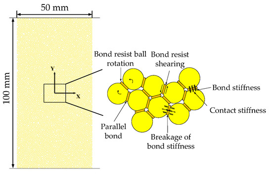 PFC2D was used to build the equivalent numerical calculation model of rock. According to the size of rock samples in the laboratory, the size of the two−dimensional numerical model was set to 50 mm × 100 mm. The bottom and top surfaces of the model were loaded by rigid walls, and the left and right sides were free boundaries. To accurately represent the mechanical characteristics of rock, the parallel bonding model was adopted for the contact constitutive model between particles [37]. The steps were as follows. (1) the initial model was established, and particles with a random radius in the range of 2.5–5 mm were generated in the container. The radius enlargement method was used to adjust the distribution of particles until the internal stress was balanced. (2) The internal stress was adjusted, and the boundary position of the model was constantly adjusted so that the internal stress between the particle system was uniform and at a low level, the radii of the suspended particles with values less than one were enlarged, and the suspended particles contacted other particles to ensure the overall density of the model. (3) The particle bonding parameters were set, and a numerical model was generated, as shown in Figure 1.