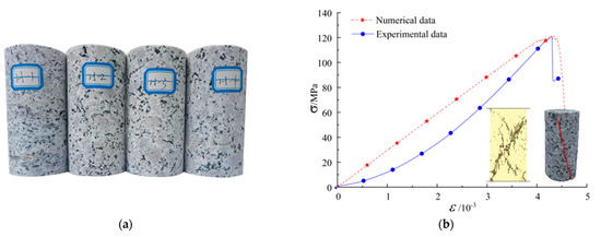 Laboratory test and numerical simulation. (a) Rock specimens (b) Numerical simulation results.