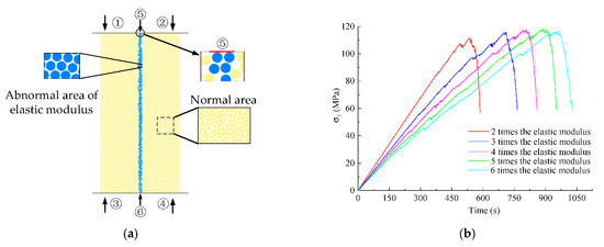 Rock model with abnormal elastic modulus and results of uniaxial compression test. (a) Elastic modulus abnormal area rock model; (b) Axial stress−time of rock with different elastic modulus.