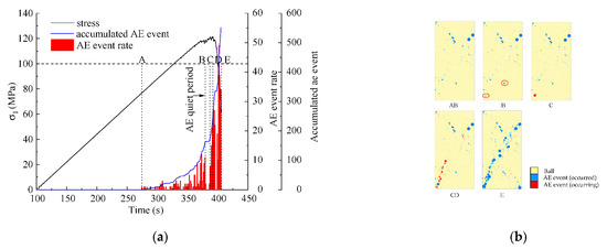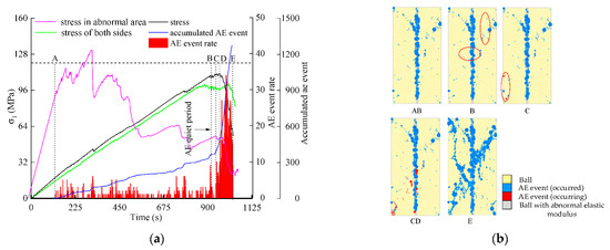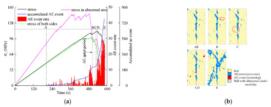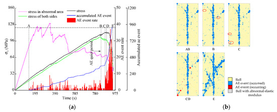 - Stages D to E. The rock model produces a macro fracture while the axial stress reaches its peak. In Figure 5a, Figure 6a, Figure 7a, Figure 8a and Figure 9a, the axial stress in the abnormal area and normal area are slowing rapidly. The AE event rate and the cumulative number of AE events increased rapidly. In Figure 5b, Figure 6b, Figure 7b, Figure 8b and Figure 9b, numerous cracks and AE events were generated, a huge fracture appeared in the center of the model, and the model was destroyed.