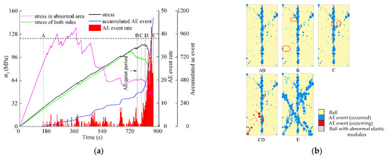 Numerical simulation results. (a) Stress and AE events of specimens with abnormal elastic modulus of 80 GPa; (b) AE events distribution at different stages of the specimen.