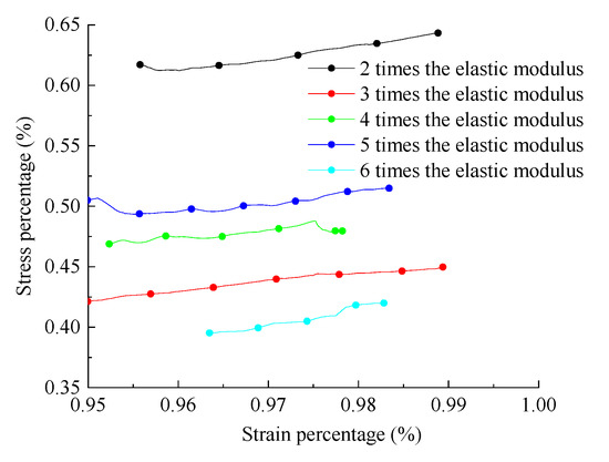 At the initial stage of loading, the stress of rock was mainly concentrated in the elastic modulus abnormal area, and a quantity of AE events mainly concentrated on the abnormal elastic modulus area. The axial stress kept increasing in the normal area, but there were few cracks, and AE events appeared. As the loading continued, the abnormal area of the elastic modulus was gradually destroyed, and its axial stress was decreased. The normal area gradually appeared in AE. When the AE quiet period approached, the axial stress in the abnormal area of the elastic modulus increased slightly, which provided a certain bearing capacity. To study the stress changes in the elastic modulus abnormal area during the AE quiet period, the axial stress and strain in the abnormal area were normalized, and the results are shown in Figure 10. It can be observed that the axial stress in the abnormal area of elastic modulus increased by 2%–5% at this time. The abnormal area of the elastic modulus and the normal area were in a balanced state, and the rock was in the AE quiet period.