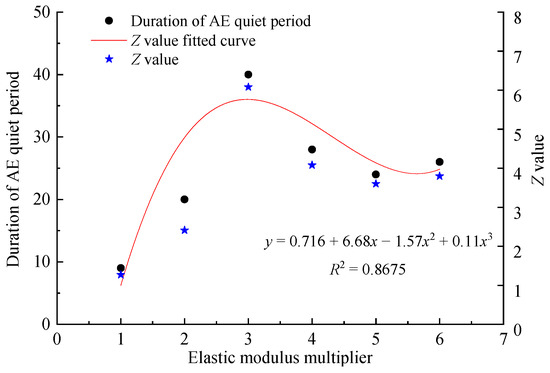 Figure 12 shows the AE quiet period Z values of specimens with different elastic modulus. The Z value without abnormal area is the minimum of 1.1. the characteristics of the AE quiet period become less significant, the elastic modulus of the abnormal area was set to three times the normal area, the Z value reached the maximum of 6.08, and the AE quiet period is the most obvious. As the elastic modulus increases, the AE quiet period slowed down considerably and gradually tended to attain a stable value. The Z value is around 4. Therefore, combined with the mechanical properties and AE characteristics of heterogeneous components in rock, it can predict the failure of rock.