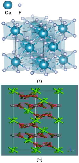 As is known to all, floatability is closely related to the quantity and type of surface-exposed elements after mineral liberation, which, in turn, depends on the crystal structure and dissociation characteristics of the mineral. Fluorite has a cubic crystal structure with a space group of Fm−3 m, a = b = c = 0.5463 nm and α = β = γ = 90°, Z = 4 [21]. The calcite crystal structure belongs to the trigonal system, with a space group of R-3c, ah = bh = 0.4988 nm, ch = 1.7061 nm, α = β = 90°, γ = 120°, Z = 6 [22].The unit cell structures of fluorite and calcite are shown in Figure 1. Although different in crystal structures, fluorite and calcite have some similar surface properties, such as calcium ion broken bonds and adsorption characteristics, which significantly affect the flotation separation of fluorite and calcite.