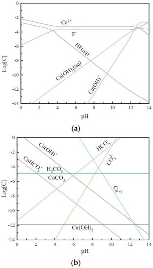 Beginning with Engel in 1889, many researchers have studied the solubility of calcite under different conditions [31,32]. The pKsp (298.15 K) values of calcite are reported to be around 8.40 [33,34].The saturated solution compositions of fluorite and calcite are shown in Figure 2 [35].