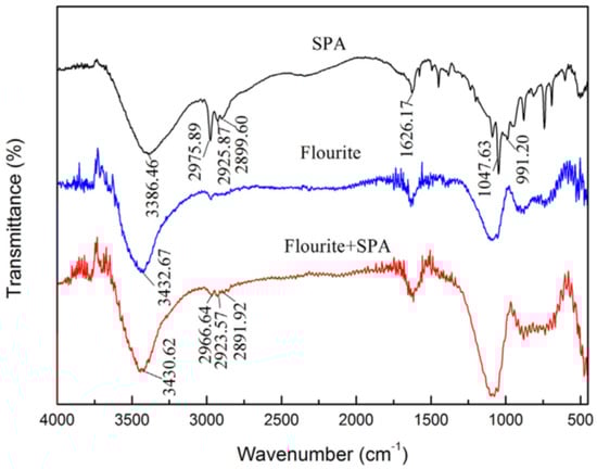 FT-IR spectrum of SPA, fluorite and fluorite treated with SPA [74].